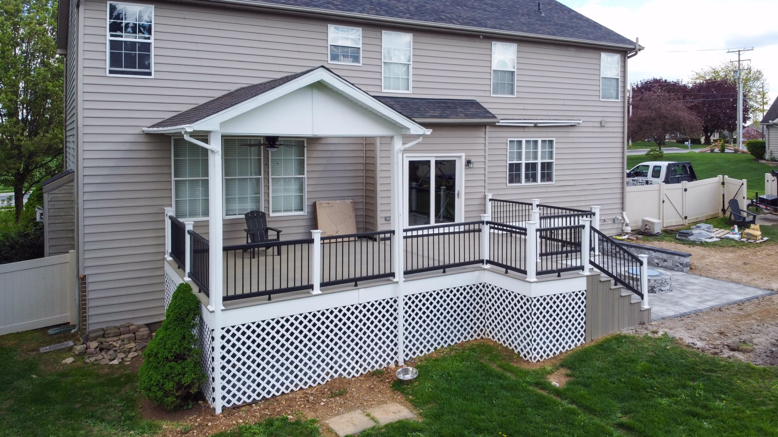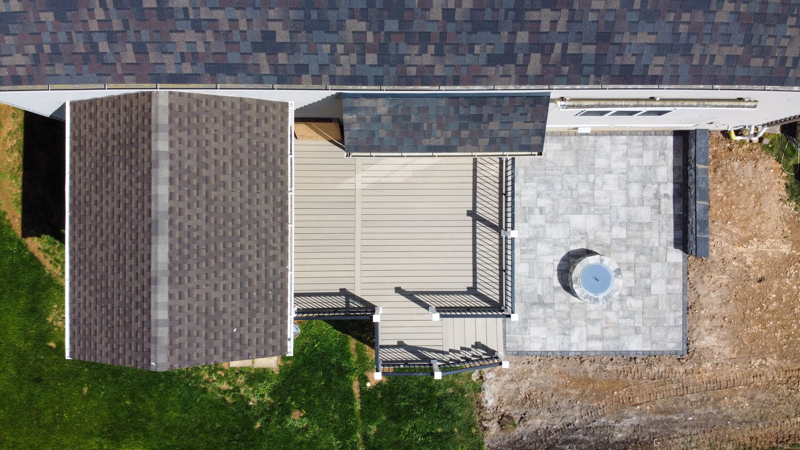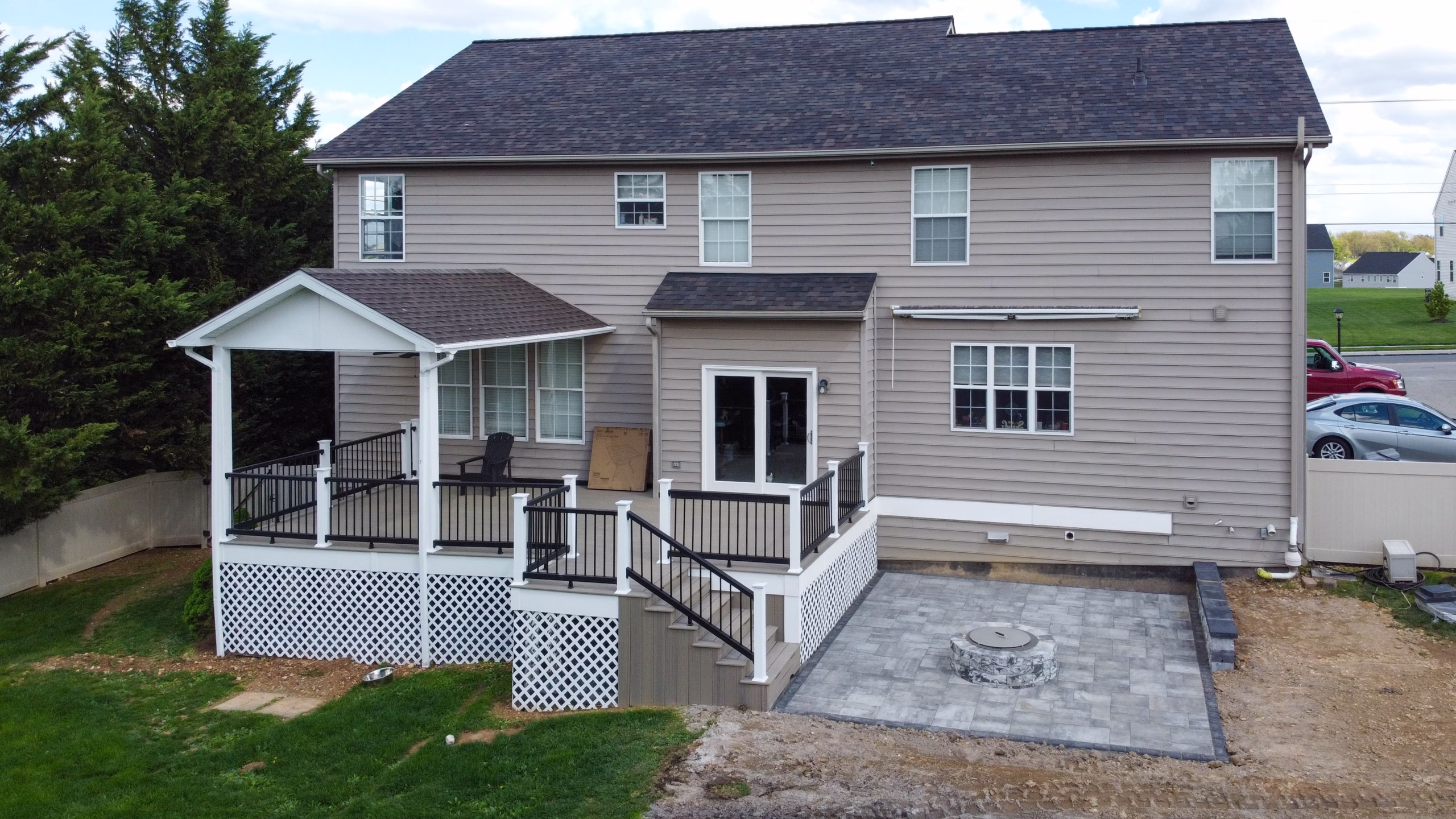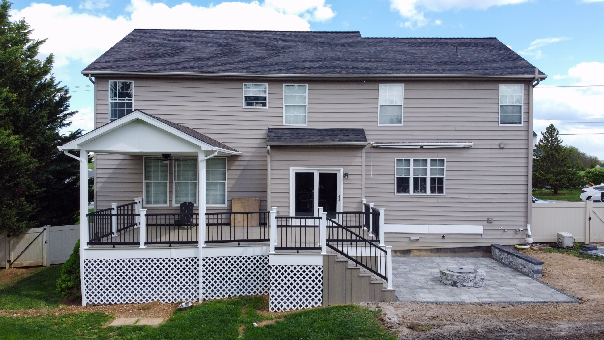 This outdoor living transformation features a spacious 28′ x 15′ custom deck integrated with a matching pavilion for year-round shade. Constructed with durable Trex decking and low-maintenance vinyl Trex railings, the custom deck offers a seamless transition down to a 18′ x 13′ paver patio. The masonry work utilizes Cambridge Ledgestone XL pavers in Limestone Quarry Blend, accented by a 10′ built-in seating wall. At the heart of the patio is a custom fire pit featuring a premium Breeo stainless steel insert, creating the perfect atmosphere for evening relaxation.